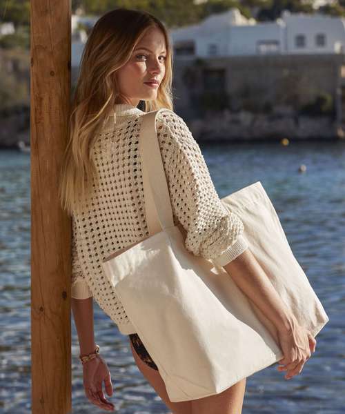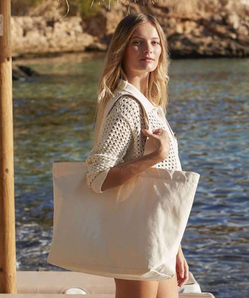 Premium heavyweight fabric. Natural wooden toggle closure. Cotton webbing carry handles. Can be carried by hand or over the shoulder. Handle length: 60cm. 100% Certified organic cotton.