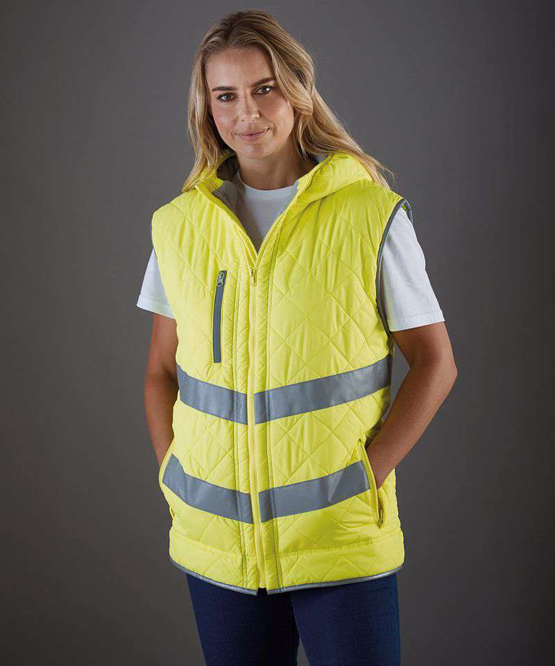 A smart-looking hi-vis gilet blended with safety, comfort, quality and style. Soft touch, nicely quilted and showerproof. Hi-vis Yellow & Orange compliant to EN ISO 20471: 2013 Class 2; Orange also compliant to RIS-3279-TOM for railway industry. Two 5cm width “V” shape reflective tapes on the body. Fleece lined hood with elastication, both the chest pocket & two hand-warmer inset pockets come with zip closure. One large patch pocket on the inside fixed fleece lining. Additional reflective piping around the elasticated arm holes and on the bottom of the body offering extra visibility and cool look in the dark. Great colour choices for both work and leisure wearing. Inner bottom concealed zip decoration access.