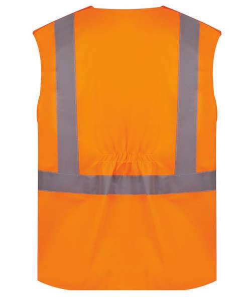 Conforms to ENISO20471 Class 2 and RIS-3279-TOM for railway use and EN510 for anti-entanglement. One 5cm width reflective tape around the body and one over each shoulder. "II" shape reflective tape in the front and at the part elasticated rear. Hook and loop fastening in the front and on the shoulder and at sides for quick-release in case of emergency.