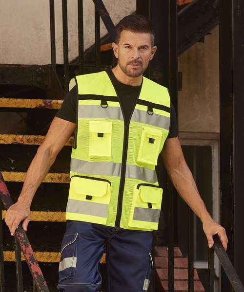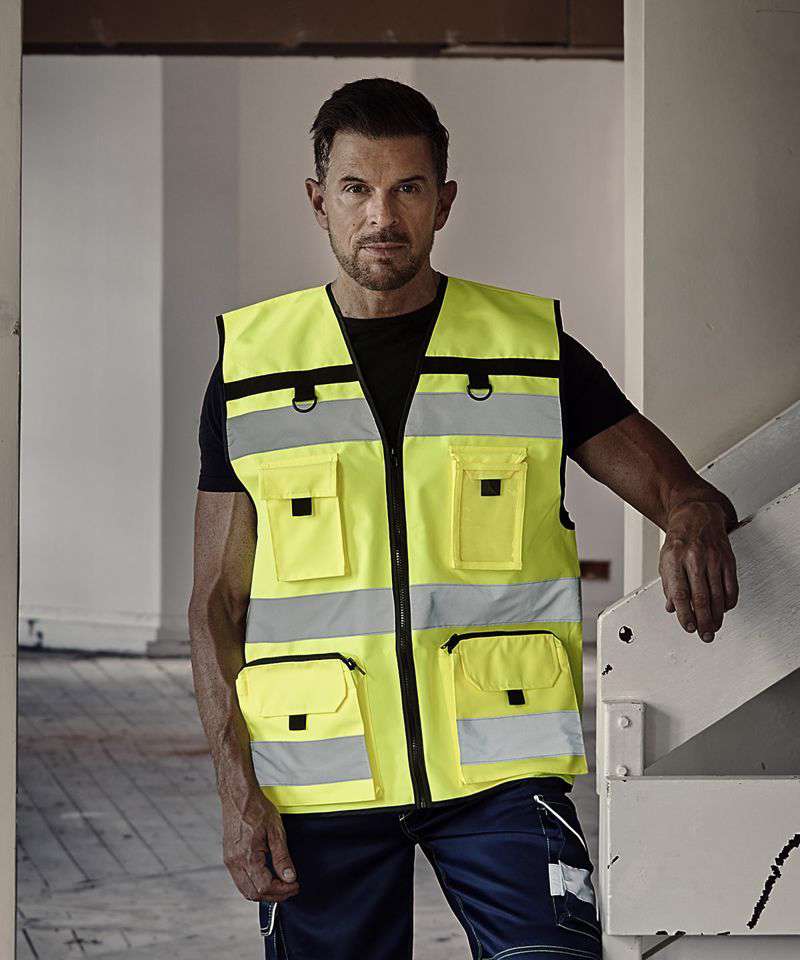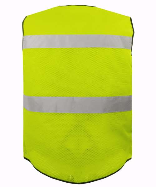 Heavy-duty, hi-vis ripstop tool vest with multiple pockets for convenience at work. Two double pockets accessed from the top with zip and hook and loop closure. Double D rings. Chest pockets with flap closure and pulls. ID card display. Adjustable hem with two press buttons. Also available with open mesh on the bottom to provide better breathability and comfort in hot working environments and seasons. Conforms to EN ISO20471:2013 Class 2. Large decoration area on the back. Certified Sedex and OEKO-TEX®.