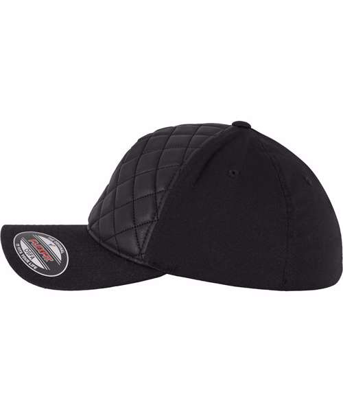 Diamond quilted Flexfit cap. Athletic Shape. Hard buckram. Silver coloured undervisor. Quilted leather imitation front.