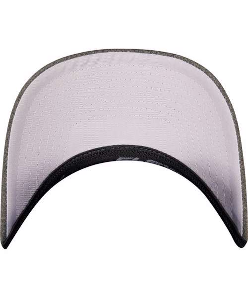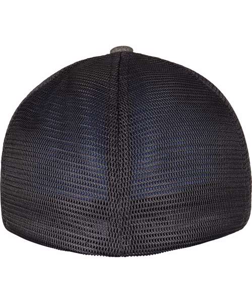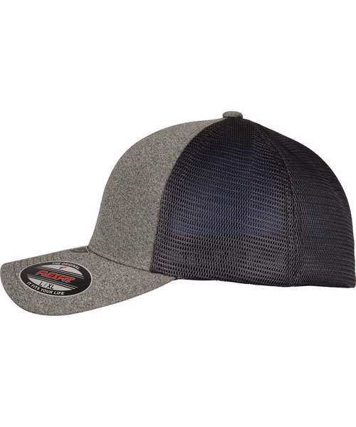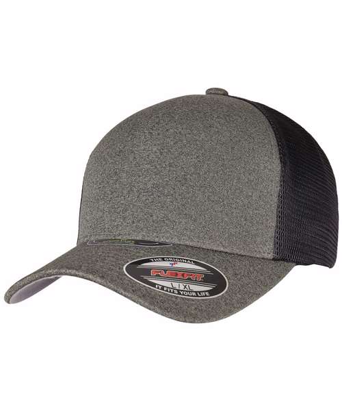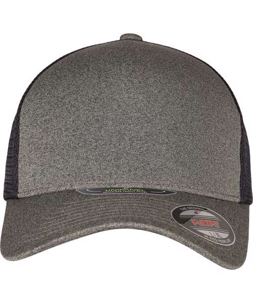 Two-tone, unipanel trucker cap with Flexfit technology, polyester mesh, mottled front, seamless front, pre-curved, and eightfold quilted visor.